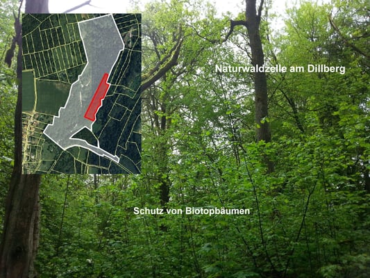 Strukturen untersucht. Ausgewählt wurden zwei Flächen: Eine Waldfläche am Dillberg, in der gezielt Biotopbäume geschützt werden, sowie eine weitere Fläche